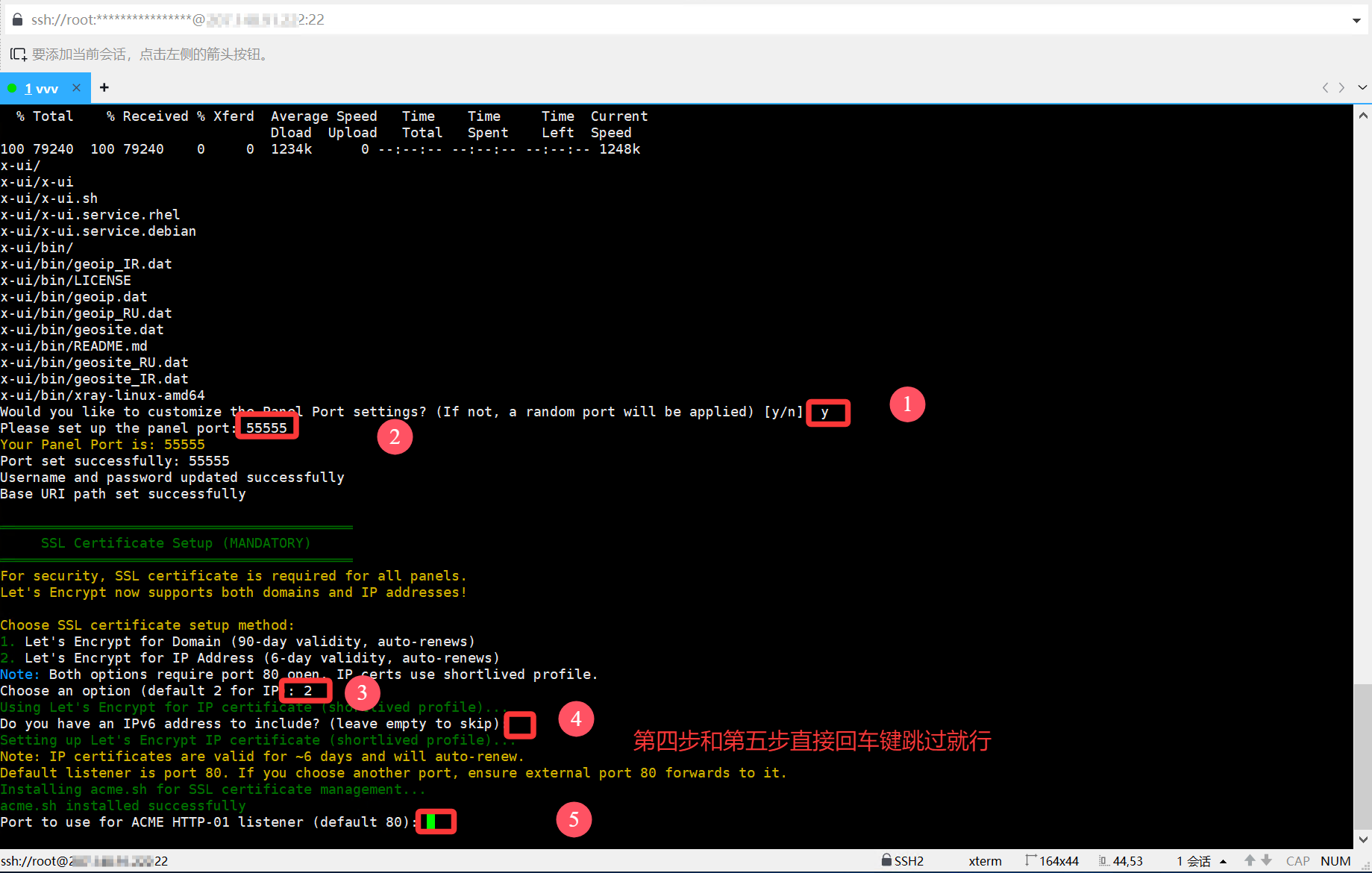 (将 55555 和 55556 替换为你自己设置的面板端口和节点端口)